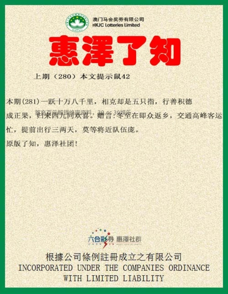 [惠泽了知]281期:一跃十万八千里,解18鼠。相克却是五只指,解05牛。行善积德成正果,归来四九同欢喜。解吉肖兔龙蛇马羊鸡。赠言:冬至在即众返乡,交通高峰客运忙,提前出行三两天,莫等将近队伍庞。